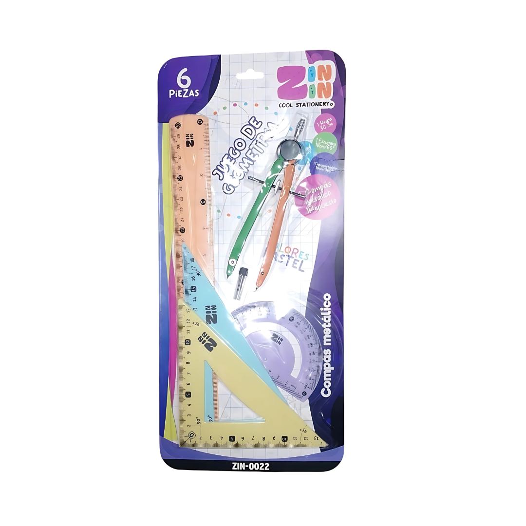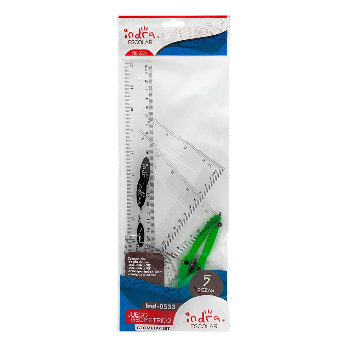 Contenido: Regla 30cm Escuadra 30º Escuadra 45º Transportador 180º Compás plastico