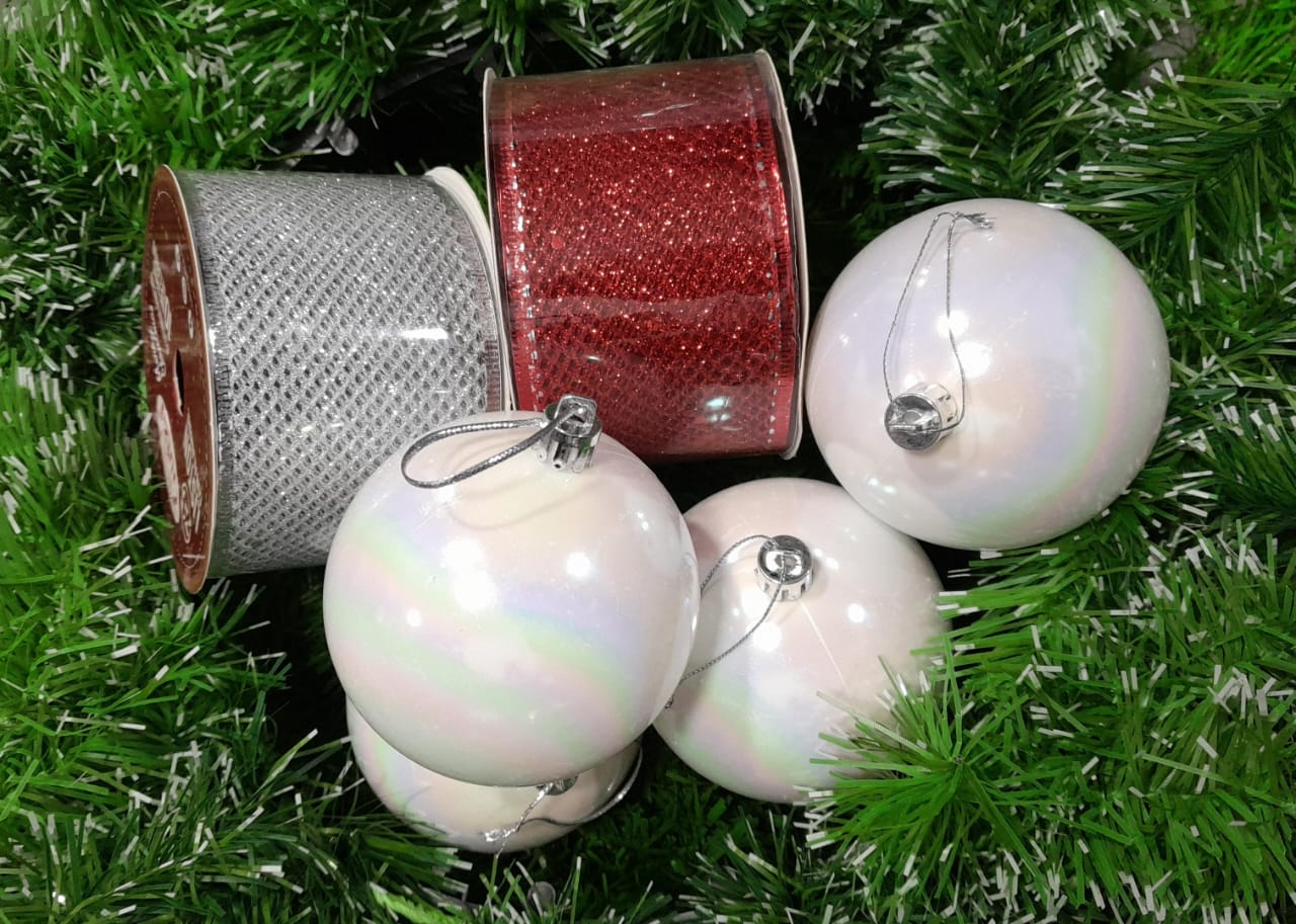 Caja con esferas de plástico diferente colores 10cm Contenido de 4 esferas.