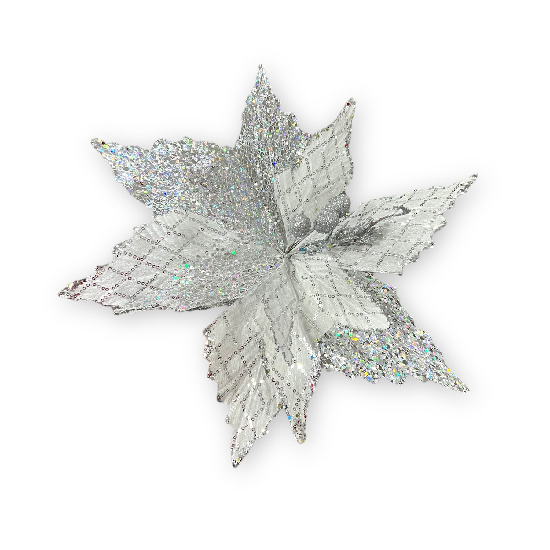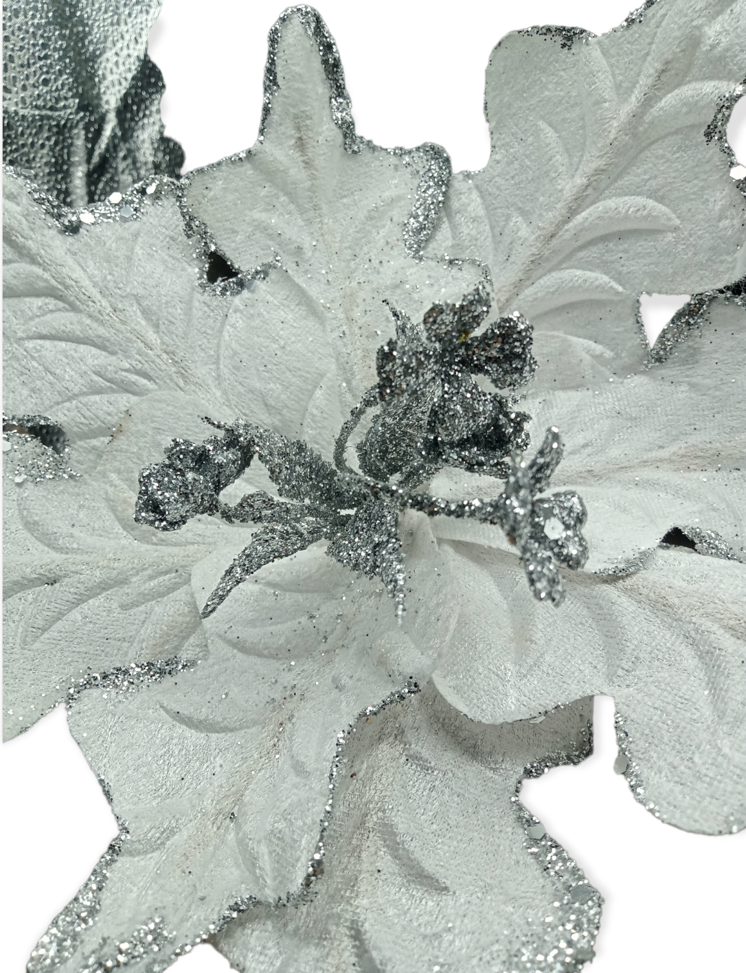 Flor navideña artificial con brillos de 49cm de alto y 38 de diámetro.