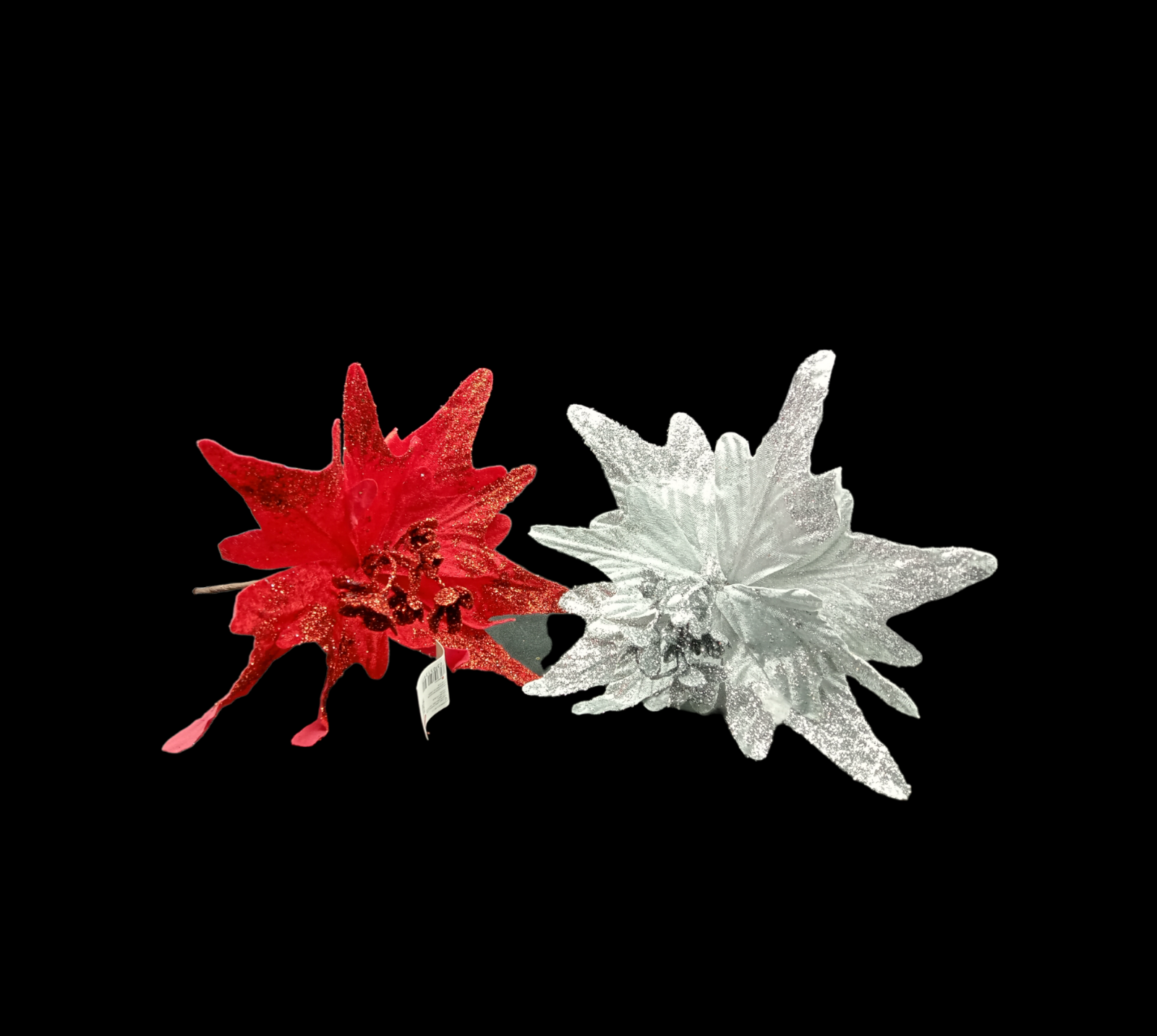 FLOR NOCHE BUENA PUNTIAGUDA CON ESCARCHA EN LAS PUNTAS Y TALLO CAFÉ. PISTILO ESCARCHADO, TAMAÑO DE LA FLOR ALTO 33...