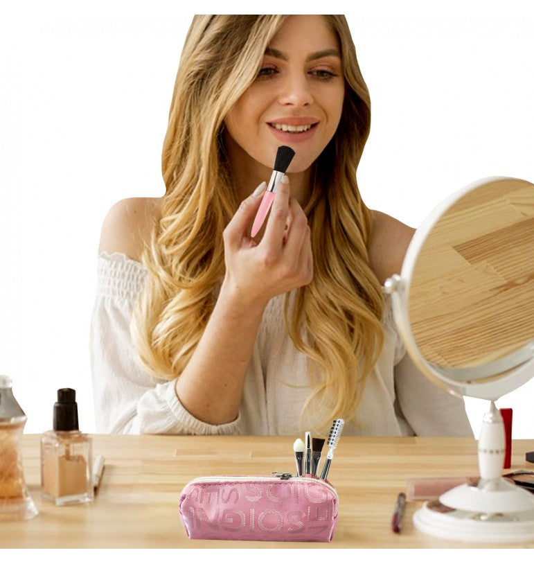 Estuche de PVC con bonito decorado en color rosa. 1 estuche y 5 brochas.