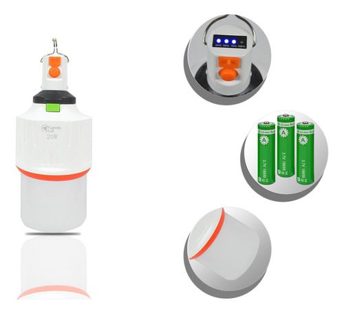 Lampara de luz blanca portátil de 20W con interruptor y puesto USB para carga. Duración de hasta 6 horas.