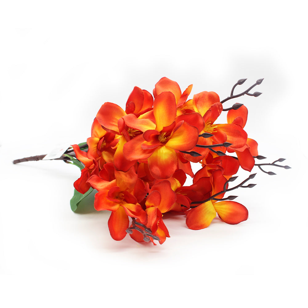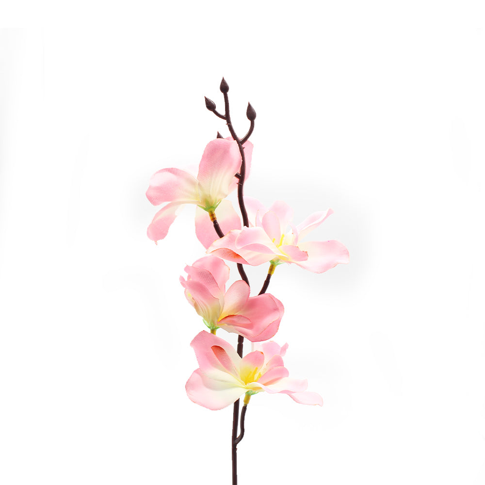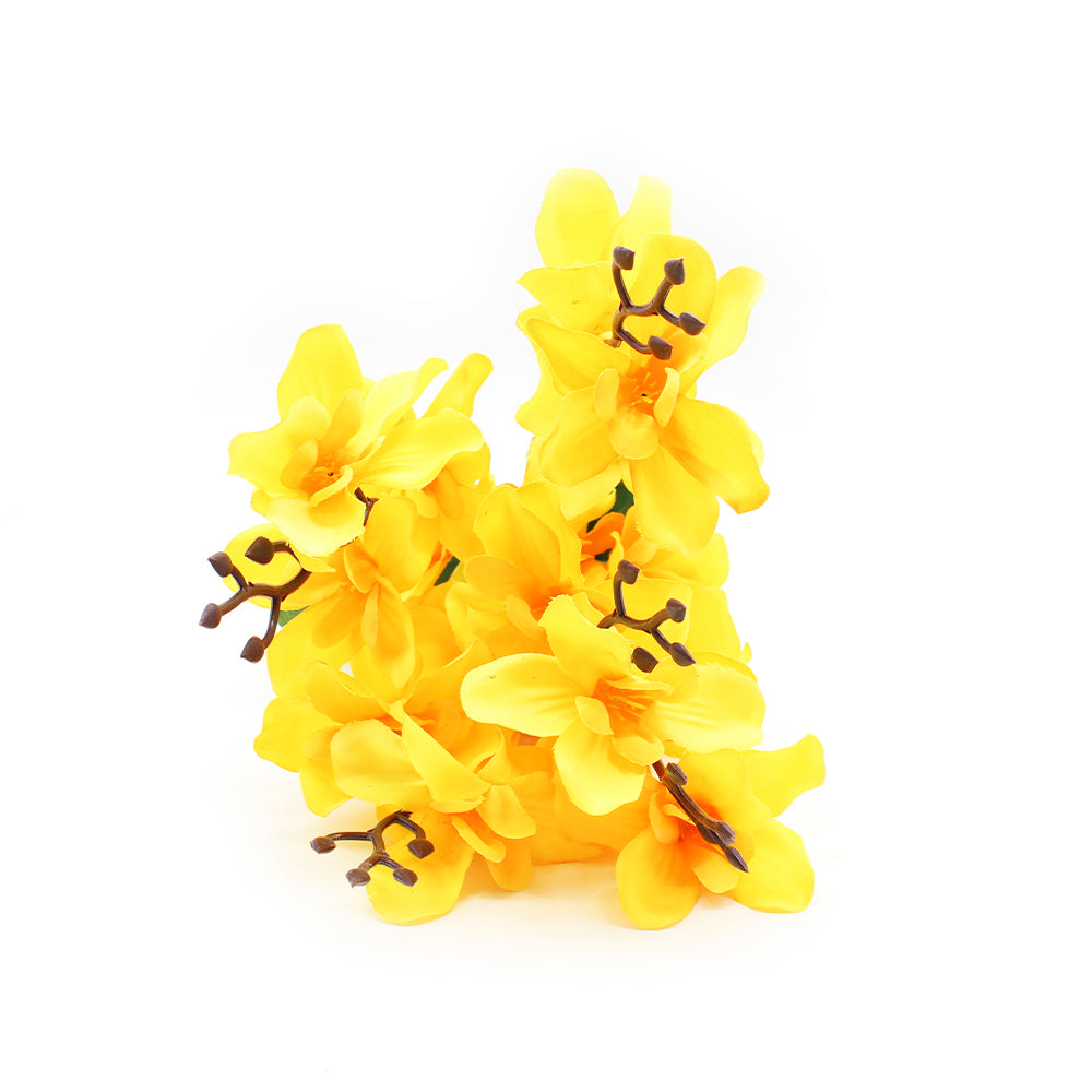 Vara de 60 cm de alto con 5 flores y hojas artificiales, centro color amarillo.