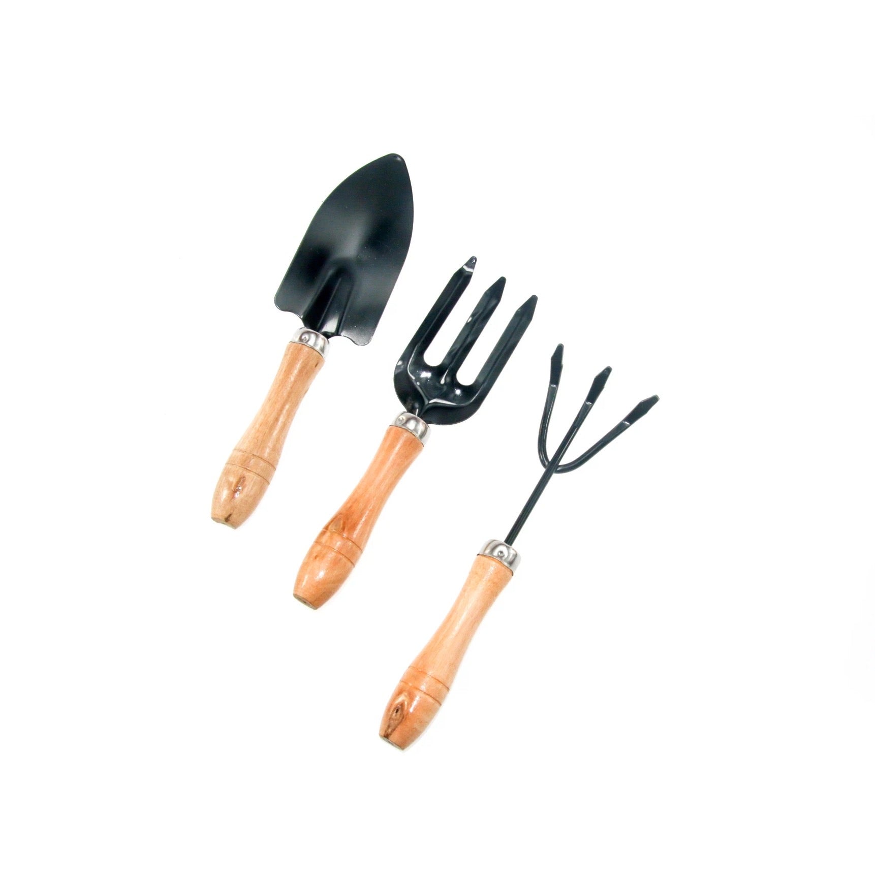 Herramientas de jardinería de mango de madera, incluye pala, angosta y rastrillo.