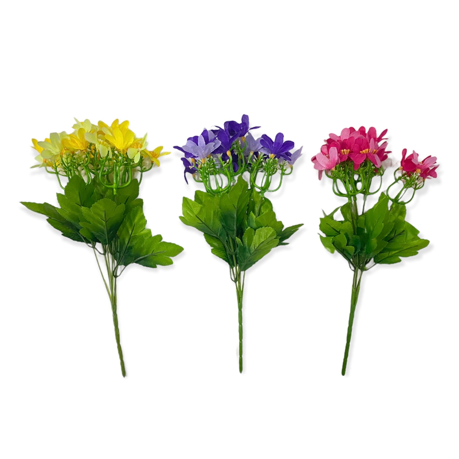 Ramo de flores artificiales con hojas bicolor y pétalos. 29 cm de alto.