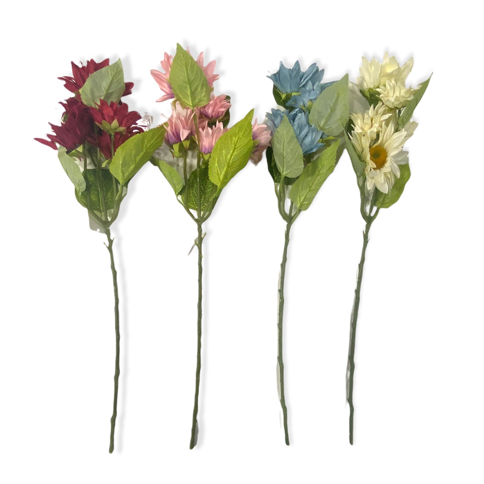 Ramo de flores individuales con pétalos de tela artificial con hojas de plástico. 35 cm de alto.