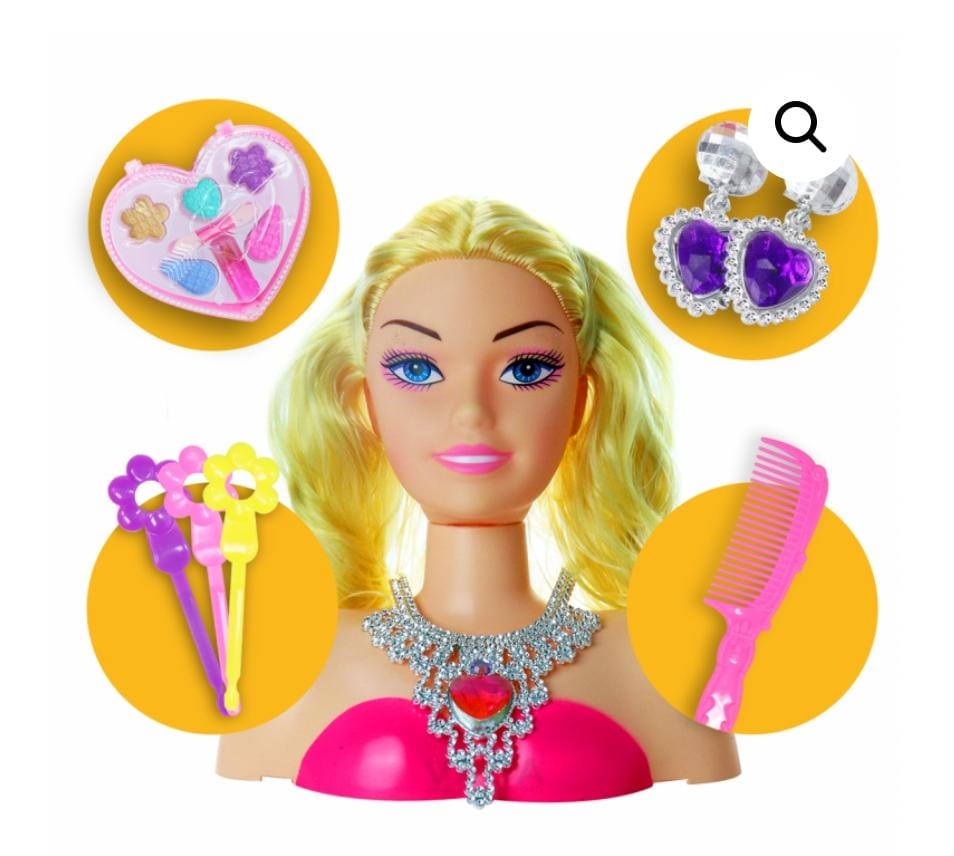 El juego de 11 piezas incluye un cabeza estilizadora Beauty, una paleta de maquillaje, un peine,, accesorios para el cabello...