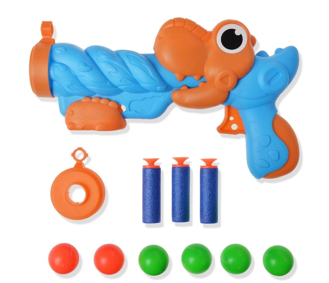 Pistola en forma de dinosaurio lanza dardos. Medidas: 18x12cm. Recomendado para niños mayores de 3 años. Incluye: 1 pistola 3...