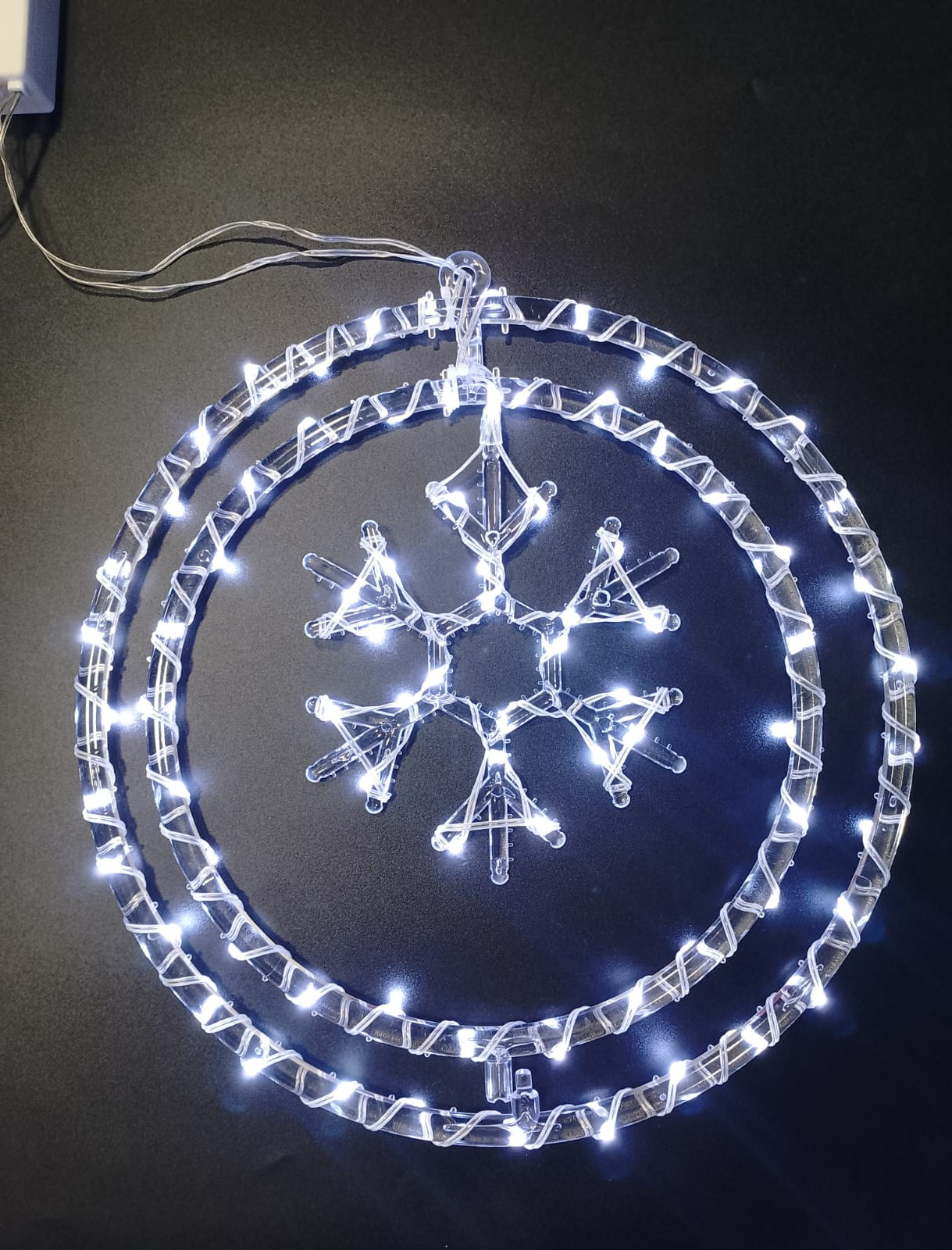 Adorno navideño colgante multicolor, multiples cambios en el patron de luces.