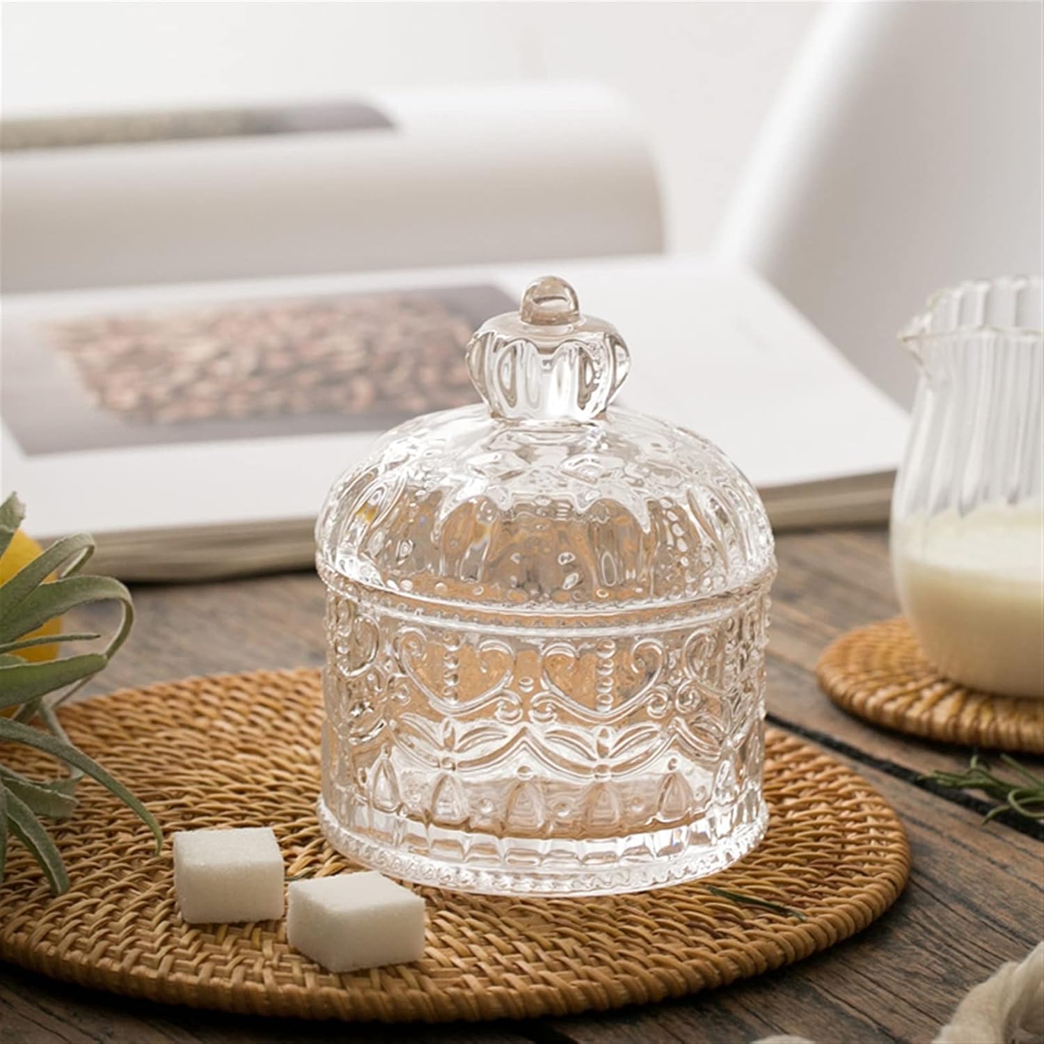 - Material: azucarero está hecho de vidrio. La superficie es lisa y translúcida, que es fácil de limpiar
