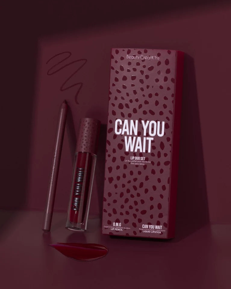 CAN YOU WAIT: Antes de que puedas decir TTYL estarás obsesionada con Can You Wait, ¡un dúo de labios inolvidable! Compuesto por una barra de labios mate líquida merlot y un perfilador de labios en gel. Este dúo es una potencia de pigmentación intensa, comodidad ligera, perfección cremosa y diversión. Con nuestro primer envase impreso y texturizado para que no sólo lo lleves puesto, sino que también lo guardes con estilo.