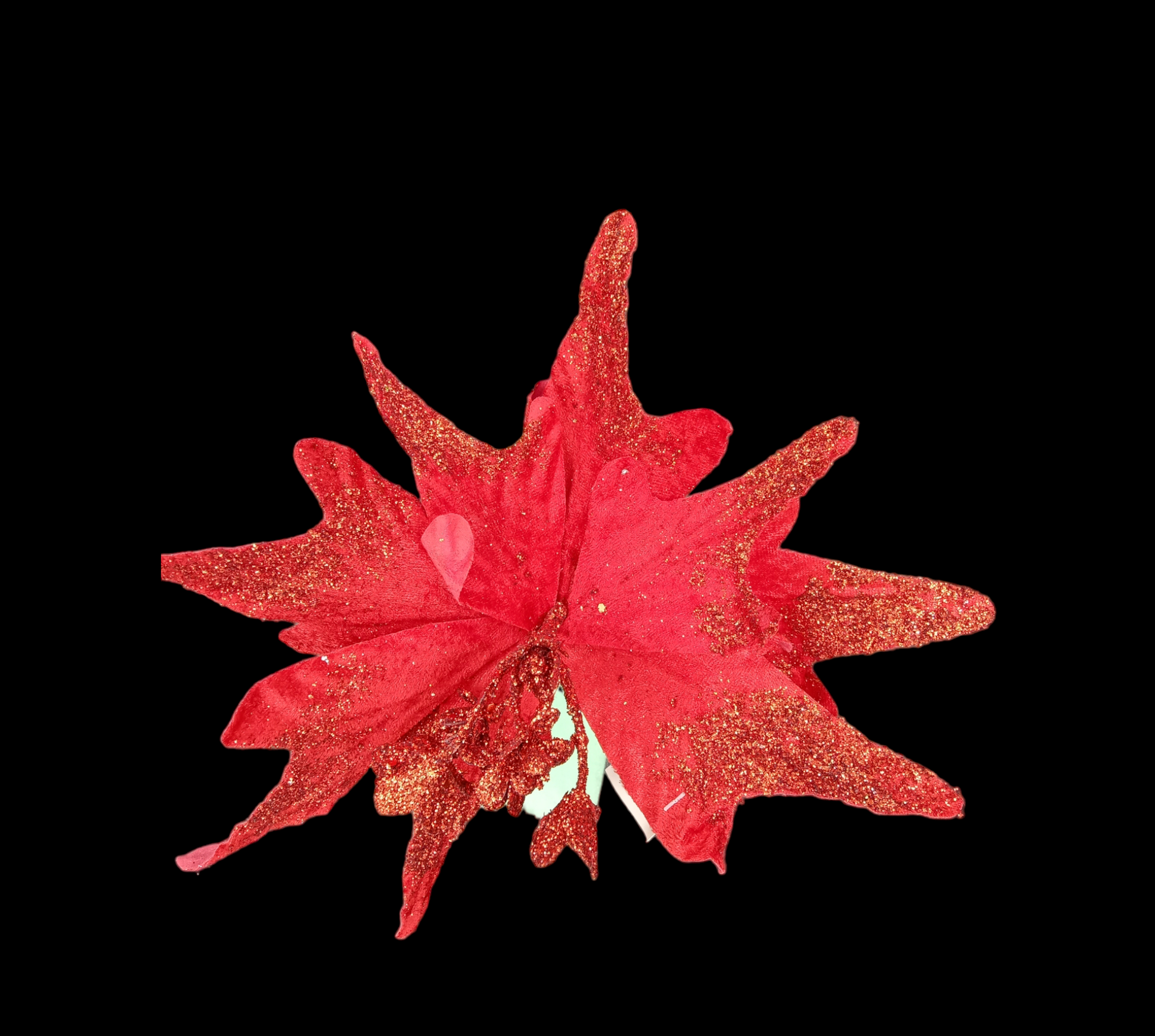 FLOR NOCHE BUENA PUNTIAGUDA CON ESCARCHA EN LAS PUNTAS Y TALLO CAFÉ.