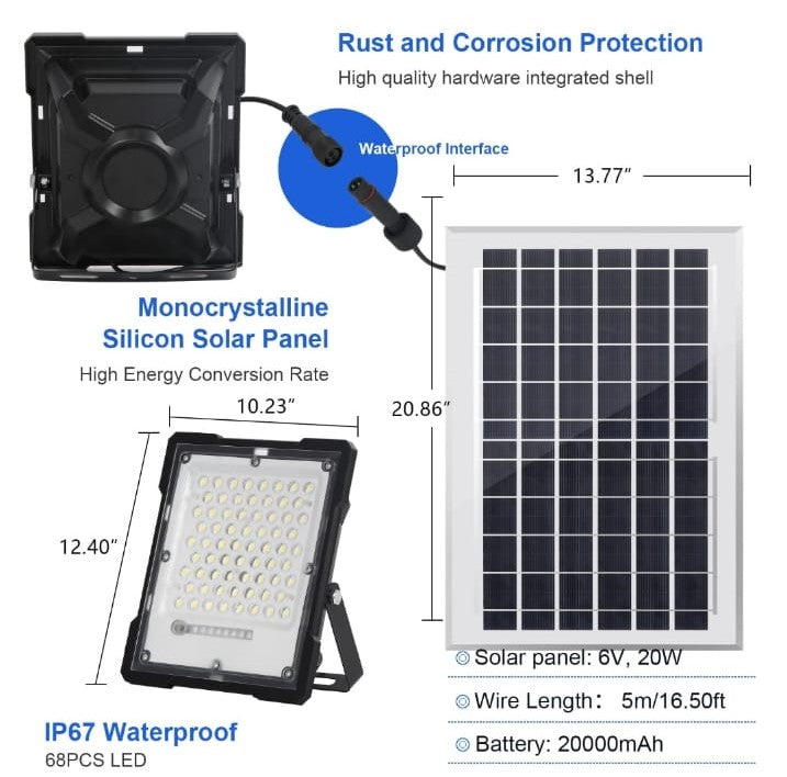 - Panel solar de polisilicio de 6 W/6 V: panel solar fotoeléctrico de alta eficiencia, puede convertir hasta el 17 % de la luz solar en energía eléctrica. Carga rápida de carga completa en 4-6h, batería recargable de iones de litio de 20000mAh 3.7V que proporciona un tiempo de iluminación continua de 8-10h con carga completa