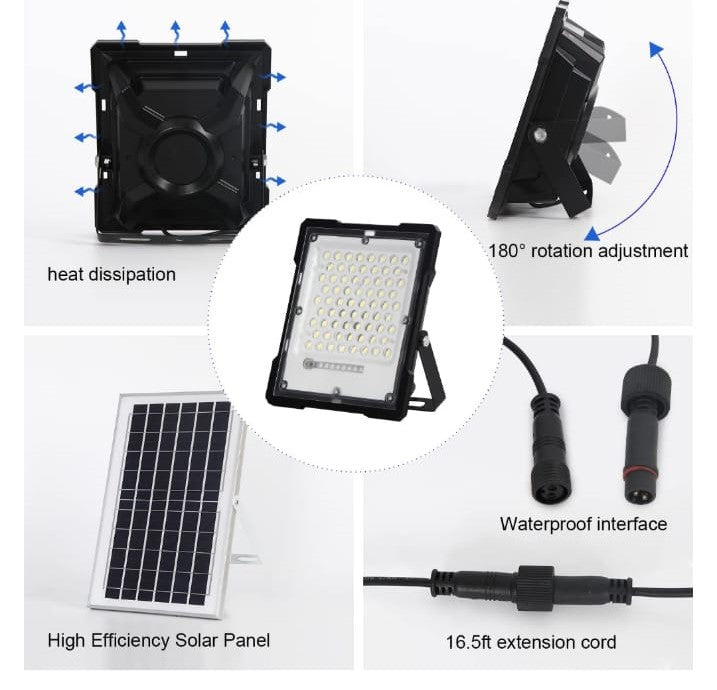 - Instalación flexible múltiple: equipado con cable de 16.4 pies que te permite montar la lámpara en un lugar oscuro y el panel solar se puede montar en otro lugar para obtener el sol directo, soporte de montaje en pared ajustable que puedes instalarlo en una pared como luz de garaje de cobertizo, úsalo como luces de inundación o utilizarlo como luz de seguridad