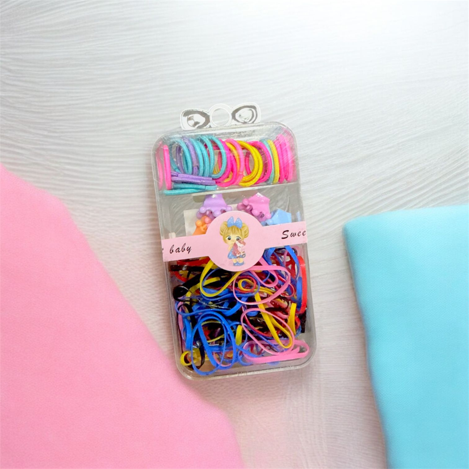 Se trata de un set de accesorios para el cabello que incluye ligas elásticas de goma y mini pinzas de mariposa en varios colores.