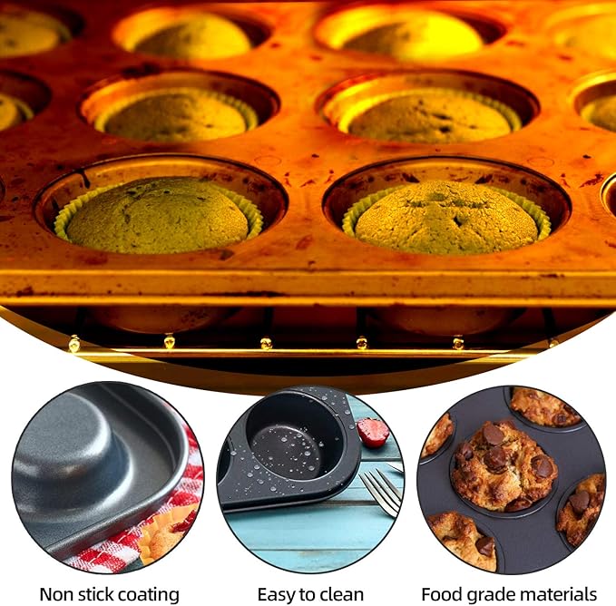 - Revestimiento antiadherente de acero al carbono superior: revestimiento de grado alimenticio, hecho de acero resistente, bien hecho, resistente y duradero, calentamiento uniforme, no se deforma fácilmente, la sartén para magdalenas se puede utilizar de forma segura en un horno de 450 F. Cuando haces magdalenas y cupcakes para tu familia, la sartén antiadherente puede liberar alimentos fácilmente y es fácil de limpiar, almacenamiento cómodo.