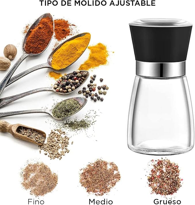 - Ajustable: fácilmente podrás ajustar la parte superior de cada salero para obtener el grosor deseado de tus especias.