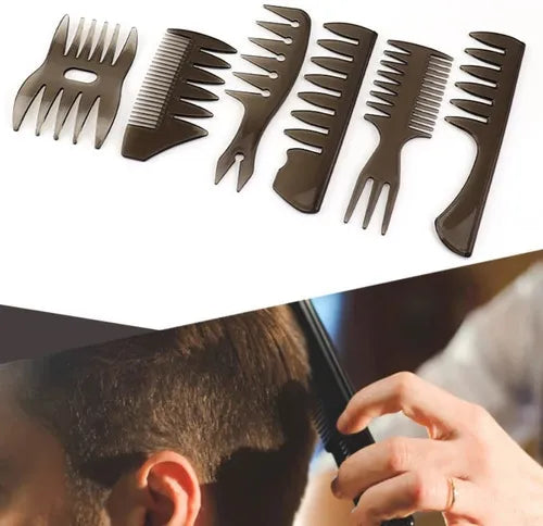 Juego de seis peines de peluquería para hombre, diseñados para diferentes necesidades de peinado.