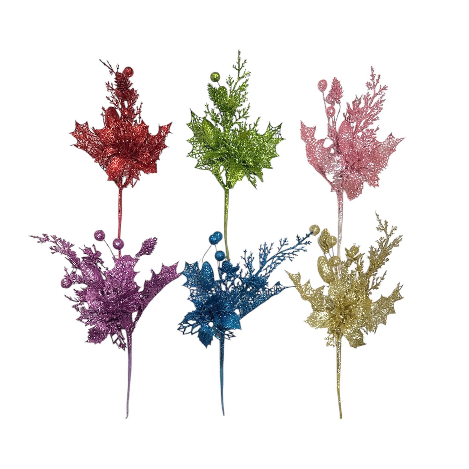 Pick con flor de noche buena, follaje y cerezos, medida 23cm